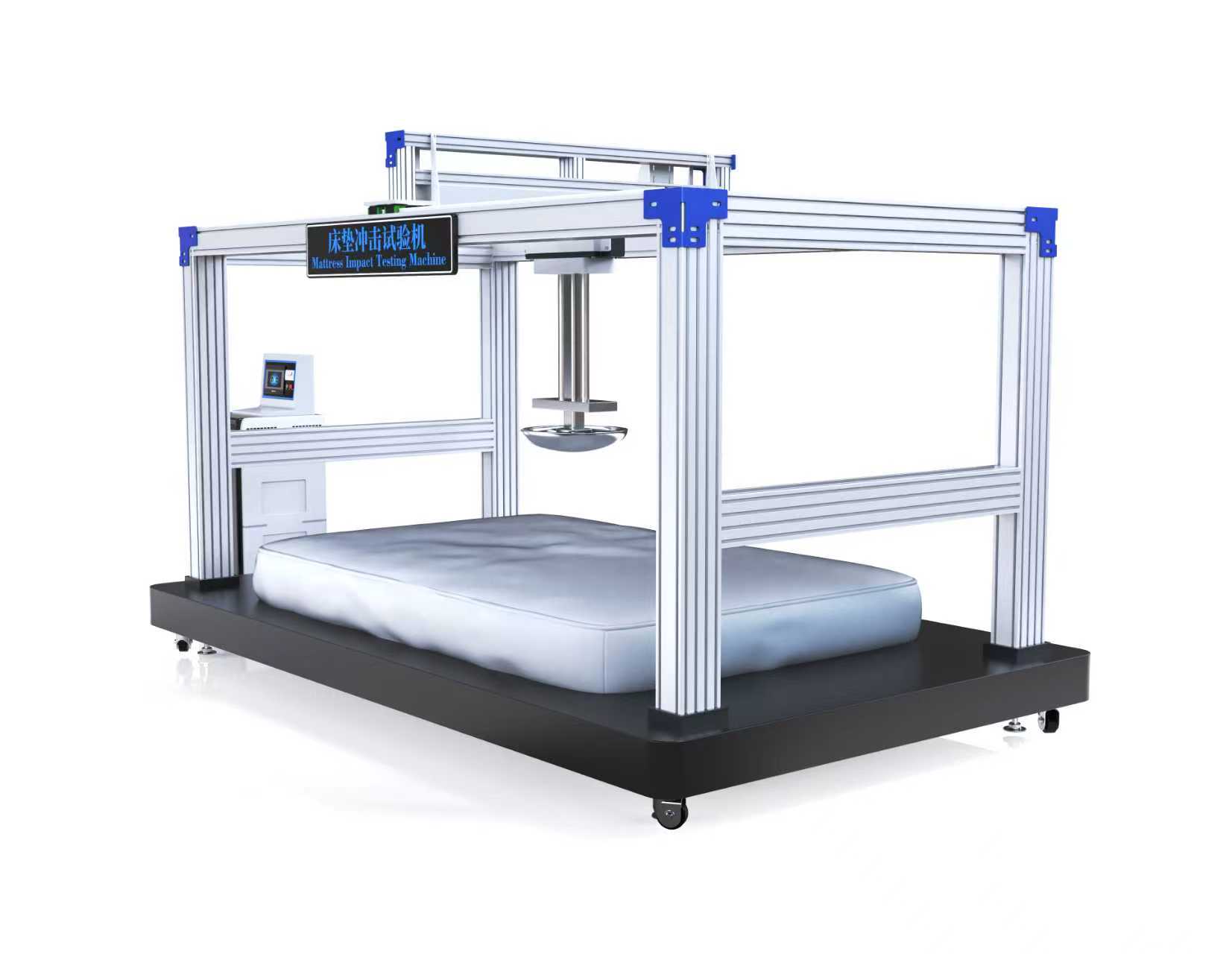 zui大可测试床垫尺寸2200×2000×400mm,冲击头中心点可对准床垫任意位置进行冲击测试。