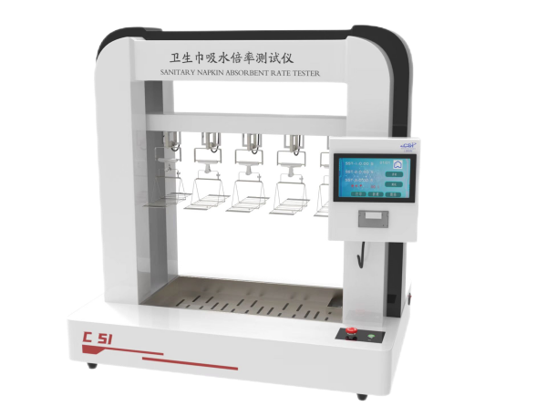 卫生巾吸水倍率测定仪根据国标GB/T 8939设计开发的一款卫生巾吸水倍率的检测仪器,主要用于女性生理性卫生巾(含卫生护垫)。吸水倍率是通过吸收后质量增加的质量与吸收前质量的比值,它反映产品浸泡一段时间后的吸水总量,吸水倍率越大说明吸收能力越强。吸水倍率的提高,主要是吸收层中加入高分子树脂,但是过度的追求高吸水倍率,会提高生产成本,同时也可能造成资源的浪费。因此卫生巾生产厂家在检测产品吸水倍率指标是否合格的同时,也可根据测试数据控制成本,以免造成成本浪费。