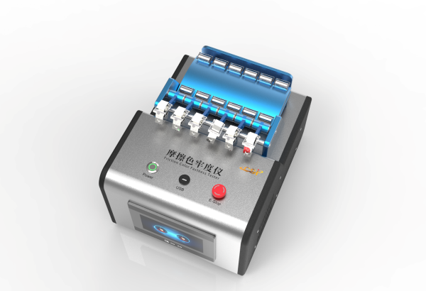 在摩擦色牢度的测试中:将约220*30mm的试样安装在试样台上,约50*50mm的摩擦用白棉布(干态或湿态)安装在各个摩擦头的前端,在2N的负重下,以每分钟30往复的速度在120mm的距离间做100往复运动,然后将白棉布取下,与评定沾色用灰色样卡相比较进行评定。