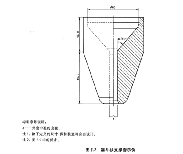 J.3.5静态试验后,使用同样的装置进行冲击力试验。将连接至导尿管锥形接头的砝码提升至其悬挂位置上方60cm处(图J.1)。对于更短且无法实现60cm的导尿管,应加长锥形接头和砝码间的距离来实现这一长度。释放砝码使其自由垂直下落,确保自由下落路径尽可能接近漏斗状支撑套。