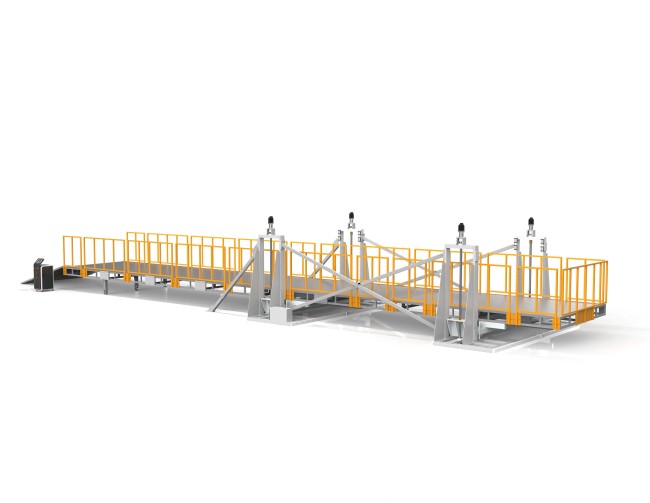 设备全部采用刚性材料焊接加工,保证机台的强度和稳定性,平台采用减速电机丝杆升降,斜坡下有可移动支撑。