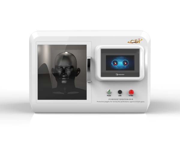 将具有良好吸附性能的绒布覆盖头模,绒布的面积质量为185g/m2以双层厚度放置。然后按要求把试样固定在头模上。在头模和眼护具之间放入试纸,将其放进毒气柜,试验柜内的氨气量由试纸控制。打开氛气发生器,将氨气注人试验柜,待柜中的试纸呈褐色时,关闭试验柜进气孔后,让试样在氨气中保留5min。待试验柜内的气体清除干净后,取出试样,同时查看试样内试纸。有刺激性气体防护性能试验