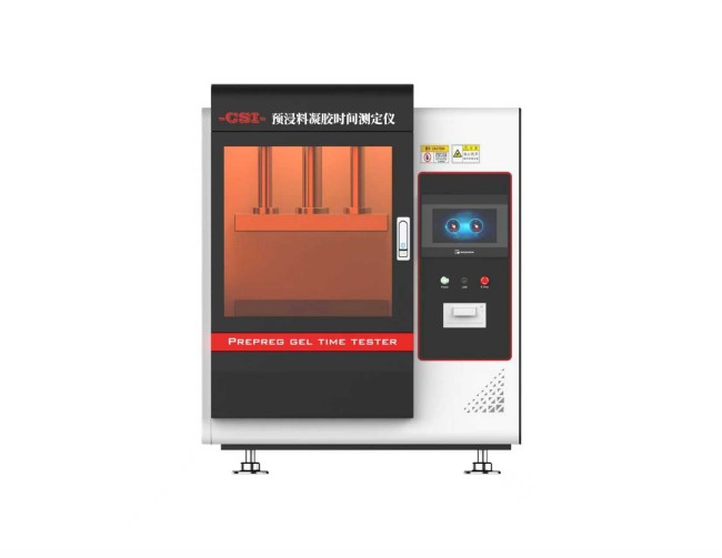 将一定大小的用不渗透薄膜包裹的预浸料试样放入已预热到测试温度的平板压机。通过平板压机对试样施加压力,将树脂挤出至平板缺口,记录从开始加压至树脂不再成丝的时间,即为凝胶时间。
