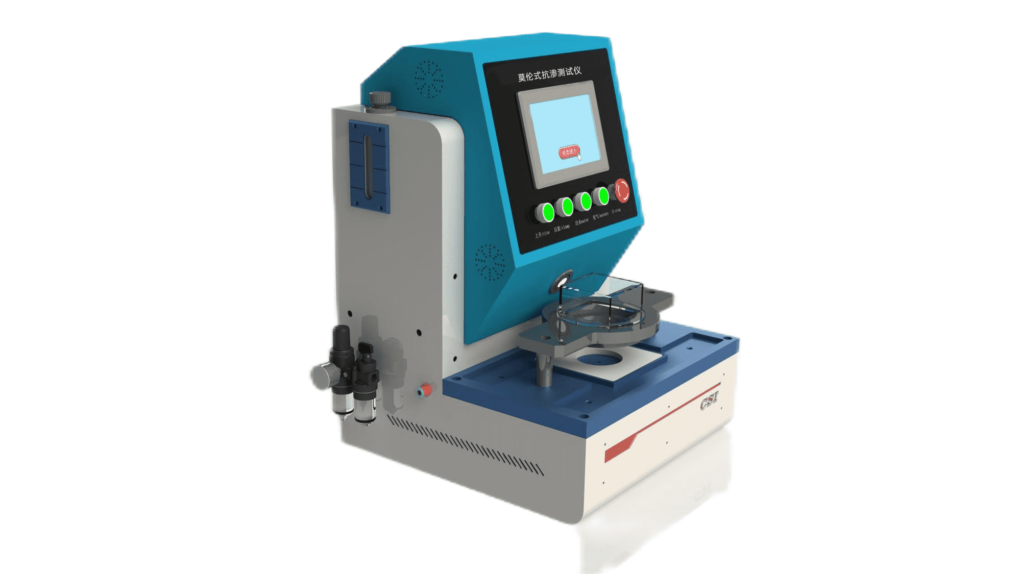 通过动态测试,静态测试两种测试方法,测试被固定在标准规定的测试区域上的试样。气压控制把0-5bar的气压到一个蓄满了蒸馏水的内置式水箱中。水箱连接着一个测试头。测试开始后,测试压力由主机根据测试指令开始自动控制。