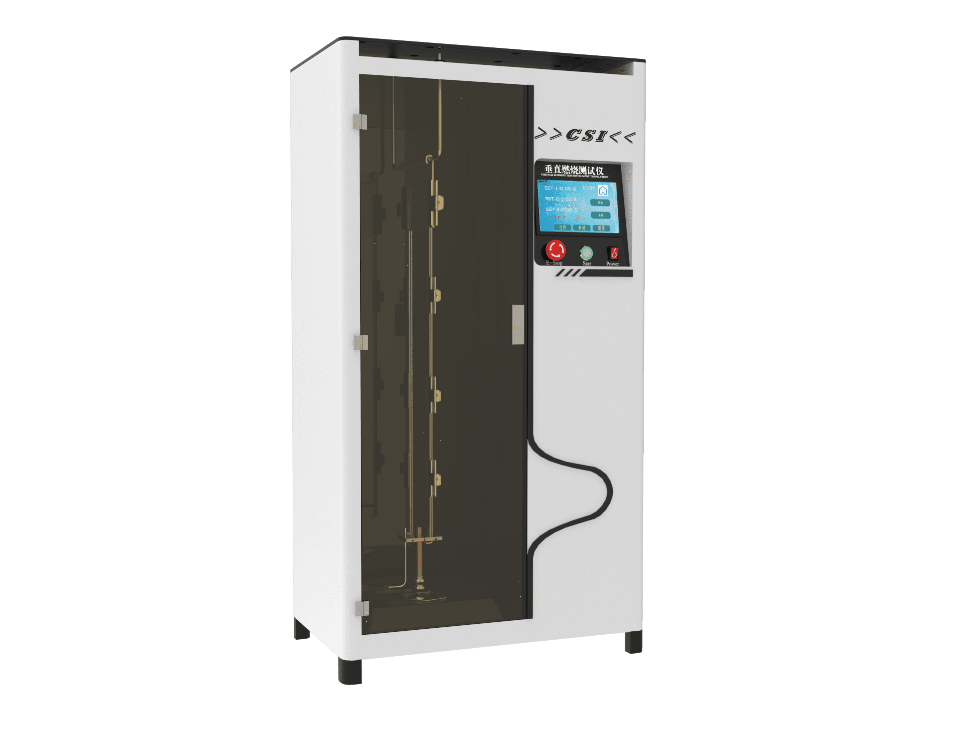 10,垂直燃烧试验箱:由耐热及耐烟雾侵蚀的材料制成,箱内尺寸为(329mmX(329)mmX(767士2)mm。箱的前部设有由耐热耐烟雾侵蚀的透明材料制作的观察门;