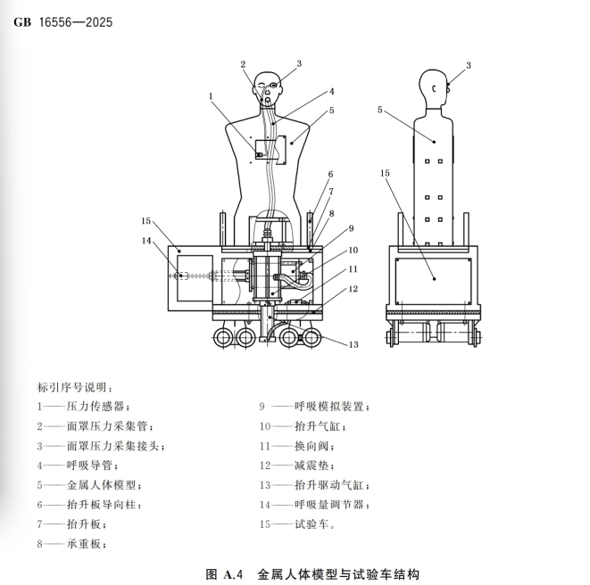 金属人体模型与试验车:金属人体模型由金属头模和金属躯干组成,安装于试验车上,试验车下部设置有可使金属人体模型垂直升起的升降系统和呼吸模拟装置。金属人体模型内设置压力传感器,与金属头模眼部的压力采集接口相连;