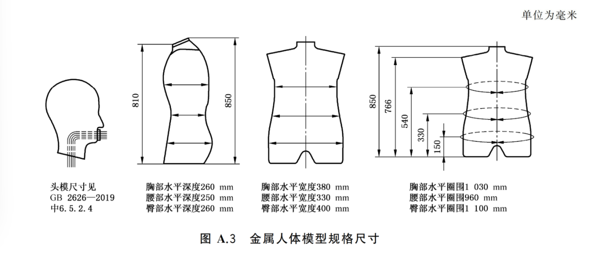 人体躯干部分尺寸:胸部水平深度260mm,腰部水平深度250mm,臀部水平深度260mm,胸部水平宽度380mm,腰部水平宽度330mm,臀部水平宽度400mm,胸部水平圈围1030mm,腰部水平圈围960mm,臀部水平圈围1 100mm;