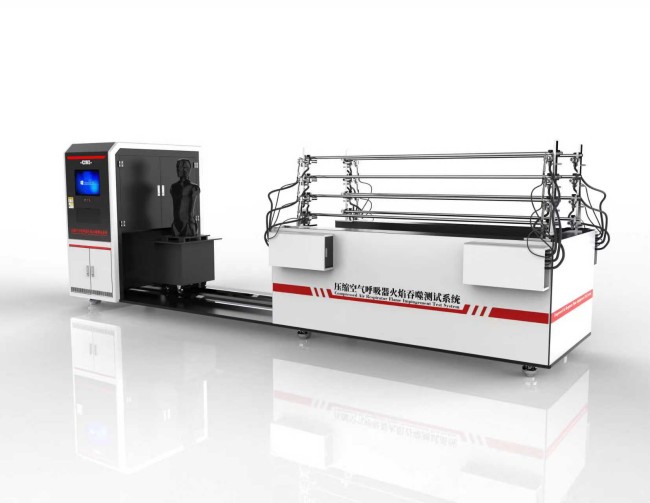 该装置主要由PLC+Windows系统,嵌入式工业电脑系统及软件、预热箱、轨道车及金属人模、燃烧器、储气装置、配气系统等组成,空气呼吸器穿戴在金属人体模型上,经由烘箱预加热后进行火焰吞噬测试并随后进行跌落测试在整个测试过程中空气呼吸器与呼吸模拟机相连接。火焰吞测试装置、燃烧器和金属人体模型的规格。测试过程中,金属人体模型穿戴符合XF10的消防员灭火服和符合 XF869的消防员灭火防护头套(未用于三次以上火焰与温度测试),移除非正常佩戴使用的保护遮盖物,测试过程中金属人体模型头部不佩戴头盔。