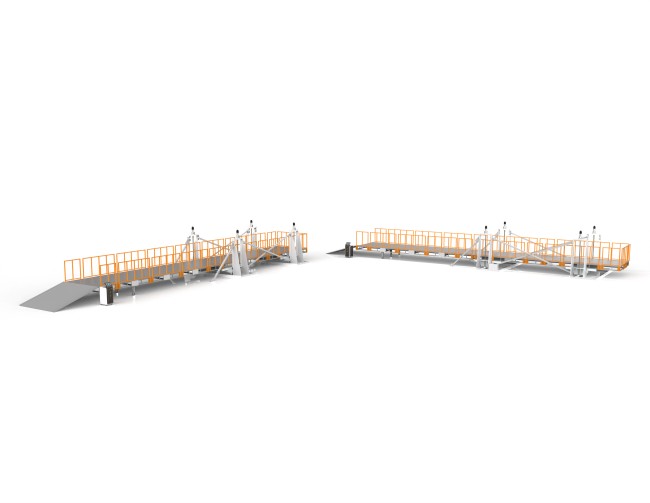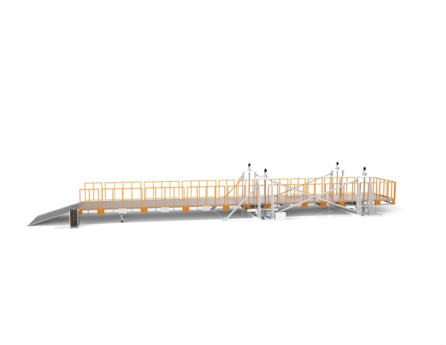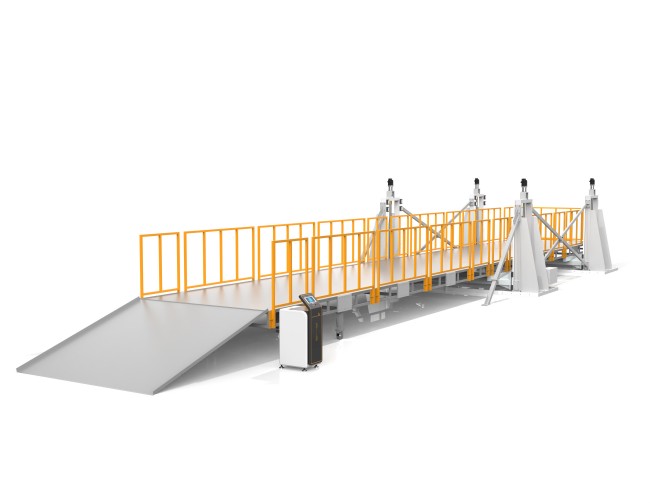 设备全部采用刚性材料焊接加工,保证机台的强度和稳定性,平台采用减速电机丝杆升降,斜坡下有可移动支撑。