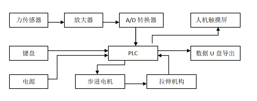 试验时,压力由力传感器测量,将强力转换成微弱的电压信号,经放大器放大,输入A/D转换器,转换成数字量,送入PLC,由LCD显示器显示强力大小;操作人员通过键盘,将操作信号输入PLC,控制步进电机作拉伸试验,测定断裂伸长和强力,试验报告J记录保存在人机界面中且可以用U盘导出。