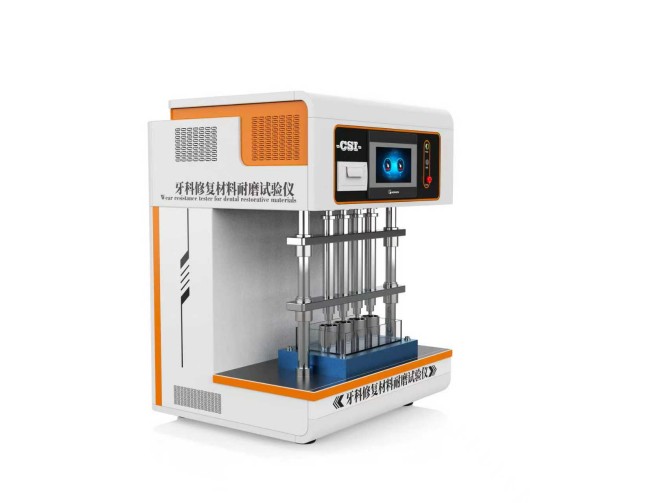 材料在模拟口腔环境下的耐磨性能,其测试原理是通过牙科修复材料耐磨试验仪在80N垂直载荷、1Hz频率下,使用44μm PMMA微珠作为磨损介质,对材料进行400,000次循环的往复磨损,终通过体积损失和深度量化其耐磨性。