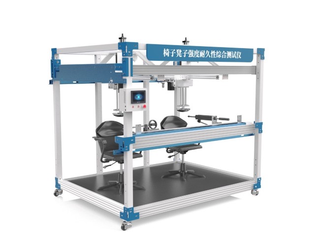 椅子凳子强度耐久性综合测试仪用于对办公椅的强度,耐久性进行测试,座面、椅背耐久性、扶手联合测试,适用于各类椅的座位、靠背静载荷测试,座面前边缘静载荷测试,也可进行座椅和椅背综合疲劳测试,完成装夹后测试过程自动完成,出现故障系统自动停止动作保护。